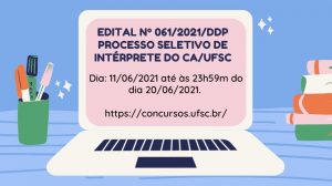 Os documentos deverão ser enviados entre as 12h do dia 14 de junho de 2021 e as 23h59min do dia 21 de junho de 2021 (horário de Brasília), exclusivamente por e-mail (selecao.pget@contato.ufsc.br) em arquivos anexos separados e em formato PDF, conforme ressaltado em cada um dos itens anteriores (item 8 e seus subitens e item 9) com a seguinte organização: (1) UM ÚNICO arquivo com documentos gerais (denominado 1_DOCUMENTOS, contendo: comprovante de inscrição, diploma, histórico, certidão de nascimento ou casamento, carteira de identidade e CPF ou passaporte e, quando for o caso, autodeclaração e/ou laudo médico); (2) arquivo com o projeto ou, se for o caso, com o link para o projeto em Libras (denominado 2_PROJETO); (3) arquivo com currículo (denominado 3_CURRÍCULO); (4) arquivo com a Tabela de Pontuação do Currículo (denominado 4_TABELA DE PONTUAÇÃO); e (5) UM ÚNICO arquivo com a(s) proficiência(s) (denominado 5_PROFICIÊNCIA, contendo a comprovação de proficiência(s) exigida(s)). No corpo da mensagem deve constar, enumerados e nessa ordem: (1) o nome completo da candidata ou do candidato; (2) a vaga para a qual se candidata (mestrado ou doutorado); e (3) o nome da provável orientadora ou do provável orientador. Link do Edital: https://repositorio.ufsc.br/bitstream… e-mail para enviar inscrição: selecao.pget@contato.ufsc.br) programa para juntar pdf online: https://smallpdf.com/